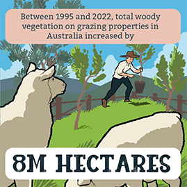 Total woody vegetation on grazing properties in Australia has increased by 8M hectares between 1995 and 2022.
